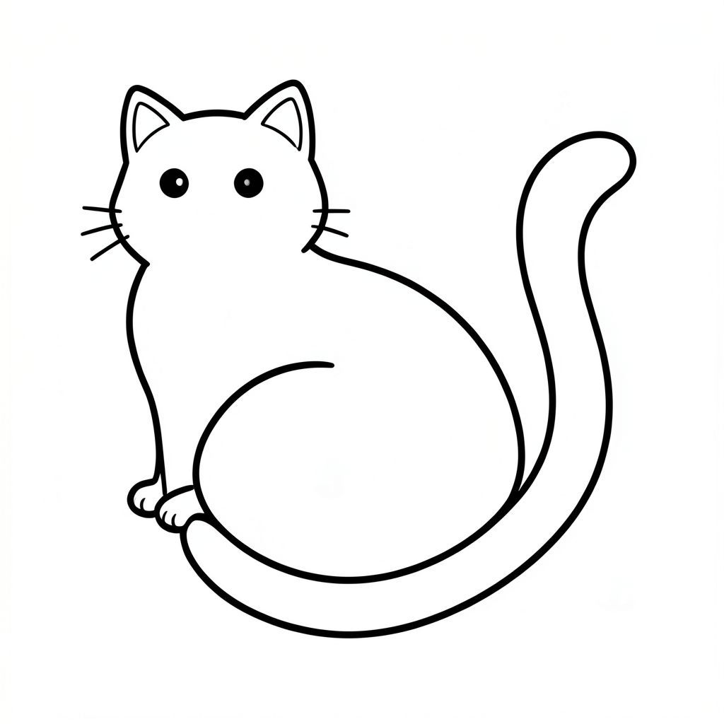 Một con mèo., trang tô màu đen trắng, phong cách lowbook, nghệ thuật đường nét, đơn sắc, không màu, không bóng, không xám, không điền, nền trắng, đường viền đen đặc, độ tương phản đậm, đường nét sắc nét, chỉ phác thảo, phong cách vector, thiết kế phẳng, 2d, chính xác một đuôi duy nhất, hoàn toàn không tô màu đen, nội thất trắng tinh khiết, không có miếng mực, không có văn bản, không từ, không có tiêu đề, hoàn toàn không có màu, Chỉ Pure Black and White Linarts
