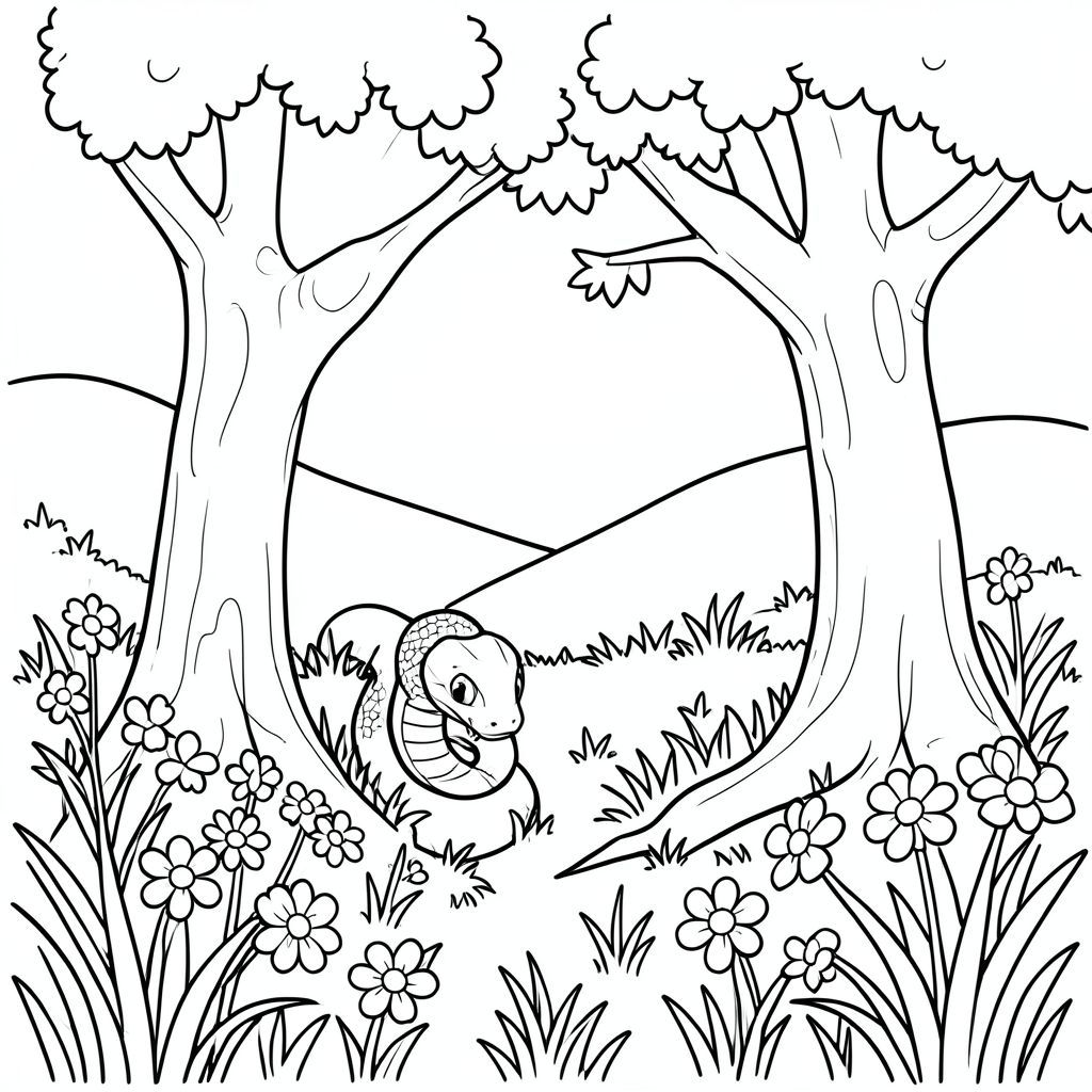 Một con rắn trên cây nhìn xuống mặt đất đầy cỏ và hoa, đồi và bầu trời trên nền