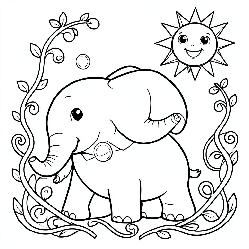 Một con voi thân thiện thổi bong bóng, được bao quanh bởi dây leo vòng tròn và mặt trời mỉm cười ở hậu cảnh.