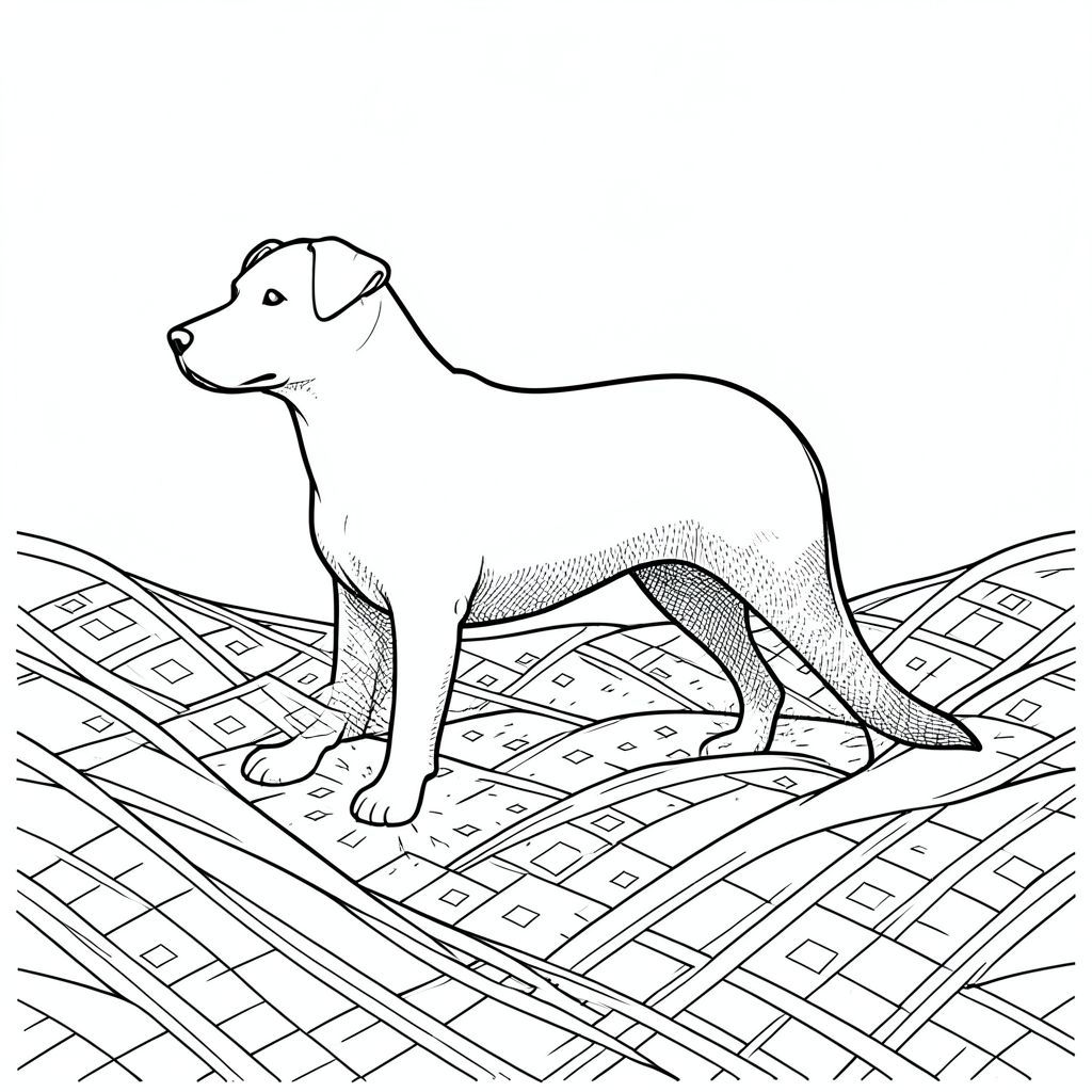 Một dạng răng nanh màu trắng mịn duy nhất nằm trên một cánh đồng đan xen, các đường nét. Đầu của ở giữa, một đường cong nhẹ đến mõm. Đuôi kéo dài duyên dáng xuống dưới, một gợn sóng tinh tế của các đường xác định hình dạng của nó. Thân máy là một đường thẳng liên tục, không bị đứt đoạn, có kết cấu tinh tế với hoa văn tinh xảo. Các đường chảy thành một đường cong thoai thoải, nhấp nhô, bắt chước gợi ý của một con dốc. Một mô hình mờ nhạt, lặp đi lặp lại của các hình vuông nhỏ, chồng lên nhau tỏa ra từ gốc của, gần như không thể nhận thấy. Ấn tượng tổng thể là một trong những sự tĩnh lặng yên tĩnh và sự duyên dáng được đo lường. Tập trung vào các đường nét chính xác, tinh tế., trang màu, nghệ thuật đường nét, nền trắng