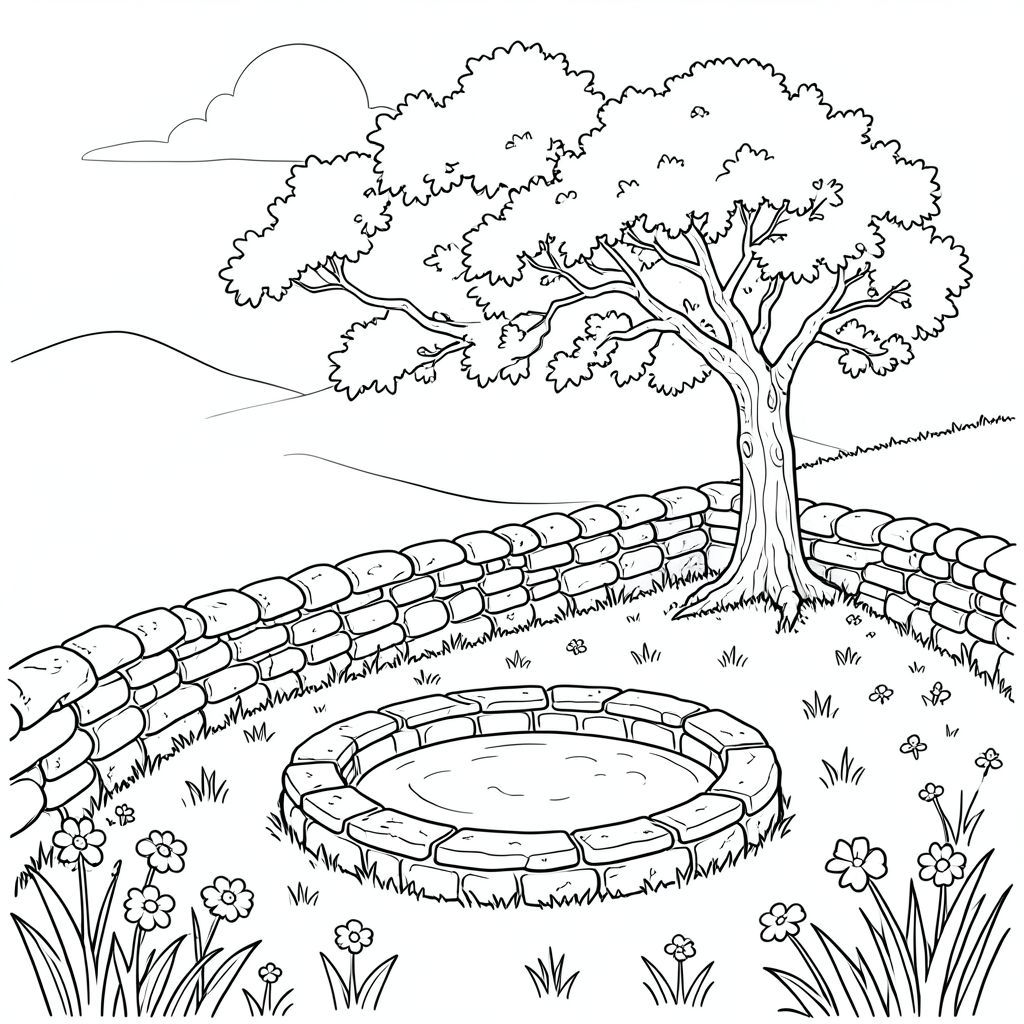 Một đồng cỏ ngập tràn ánh nắng, được bao quanh bởi một bức tường đá phong hóa, phủ đầy rêu. Đồng cỏ dốc nhẹ nhàng lên trên, dẫn đến một chậu đá nhỏ, hình tròn chứa đầy nước mưa. Một cây sồi cổ thụ duy nhất đứng ngay sau lưu vực, cành của nó vươn về phía bầu trời hơi mờ mịt. Cỏ là một , , rải rác với những bông hoa dại nhỏ, dưới bóng râm của cây sồi. Bức tường đá được đẽo thô và một, màu cát., trang màu, nghệ thuật đường nét, nền trắng