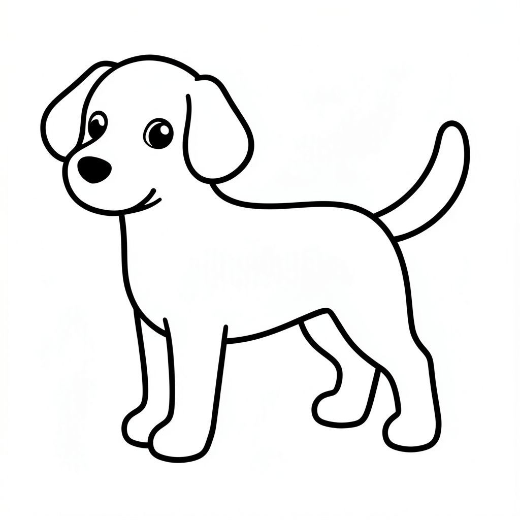Một hình bóng chó đơn giản, cách điệu. Khuôn mặt của chú chó là một đường cong nhẹ nhàng, với đôi mắt to, biểu cảm. Một đuôi cong duy nhất kéo dài từ phía sau. Toàn bộ được thể hiện bằng các đường viền dày, đậm, tạo ra một hình dạng rõ ràng, rõ ràng. Nền là một không gian trắng tinh khiết., trang tô màu đen trắng, phong cách lowbook, nghệ thuật đường nét, đơn sắc, không màu, không đổ bóng, không xám, không tô màu, nền trắng, chỉ phác thảo, phong cách vector, thiết kế phẳng, 2d, chính xác một đuôi duy nhất, hoàn toàn không tô màu đen, nội thất trắng tinh khiết, không có miếng mực, không văn bản, không từ, không tiêu đề, hoàn toàn không màu, Chỉ Pure Black and White Linarts