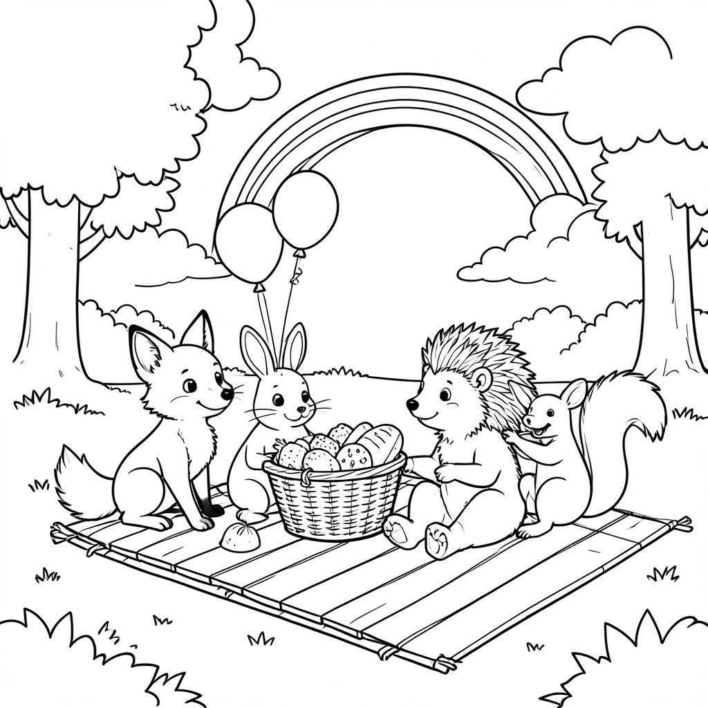 Một khoảng trống đầy nắng trong rừng, nơi một con cáo thân thiện, một con thỏ tò mò, một con nhím nhút nhát và một con sóc tinh nghịch ngồi xung quanh một chiếc chăn dã ngoại bằng gỗ lớn. Họ chia sẻ một giỏ chứa đầy bóng bay nổi, trái cây và một ổ bánh mì. Nền cho thấy một hàng cây đơn giản, cầu vồng và mây, có nhiều chỗ cho trẻ em tô màu cho động vật, đồ dã ngoại và bầu trời. Hình dạng đơn giản và đường viền rõ ràng giúp các nghệ sĩ trẻ dễ dàng điền vào.