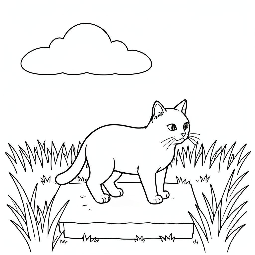 Một khoảng trống nhỏ, đầy nắng. Một mảng mây duy nhất, hơi mờ trôi qua một cánh đồng cỏ khô. Một mảng đất hình chữ nhật đơn giản được đặt ở giữa. Con mèo được đặt hơi lệch tâm, đầu hơi hướng sang phải. Đuôi uốn cong nhẹ nhàng xuống dưới. Cỏ là một trang tô màu, nghệ thuật đường nét, nền trắng