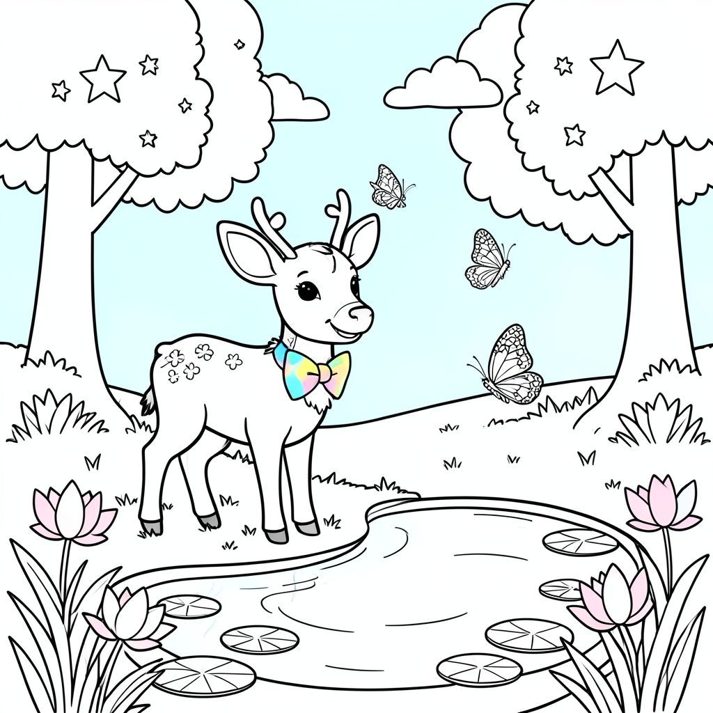 Một khu rừng vui vẻ, nơi một con hươu thân thiện đứng bên cạnh một cái ao nhỏ đầy nắng. Con hươu có khuôn mặt rộng, tươi cười và thắt nơ rực rỡ đầy màu sắc. Xung quanh ao, những bông hoa loa kèn nhỏ nổi và hoa loa kèn nảy mầm với sắc thái phấn. Một vài con bướm bay gần hươu, mỗi con có hoa văn riêng biệt mà trẻ em có thể tô vào. Ở hậu cảnh, những cây cao với những chiếc lá hình như những ngôi sao và những đám mây đơn giản lười biếng trôi trên bầu trời xanh tươi. Khung cảnh thanh bình này mời gọi trẻ em làm cho khu rừng trở nên sống động với màu sắc riêng của chúng.