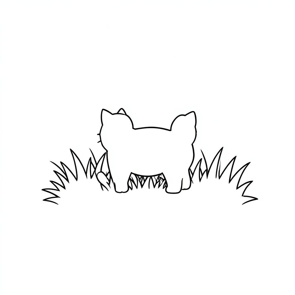 Một mảng cỏ nhỏ, hơi mờ, có ánh nắng mặt trời. Một hình bóng duy nhất, hình bóng của một con mèo được căn giữa., trang màu, nghệ thuật đường nét, nền trắng