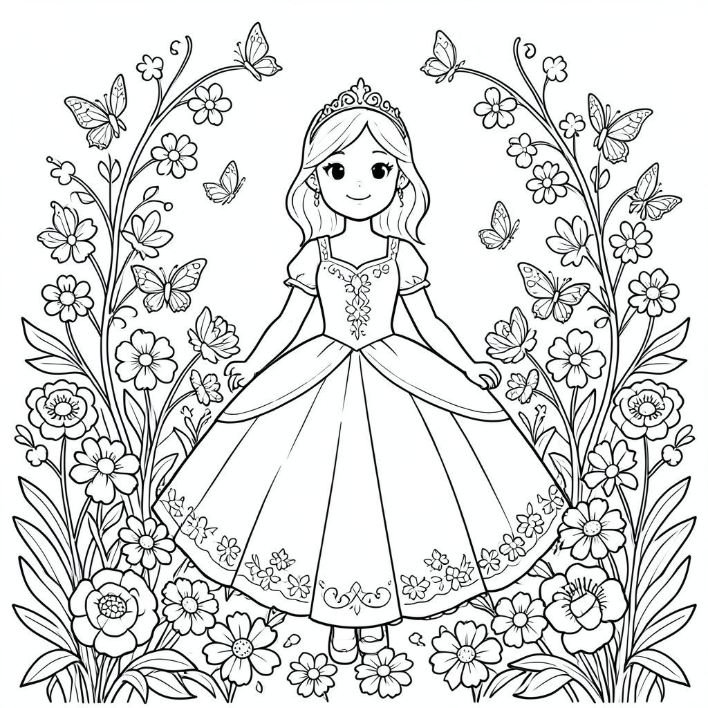 Một nàng công chúa xinh đẹp trong vườn hoa với những con bướm, các chi tiết phức tạp, phong cách trang tô màu