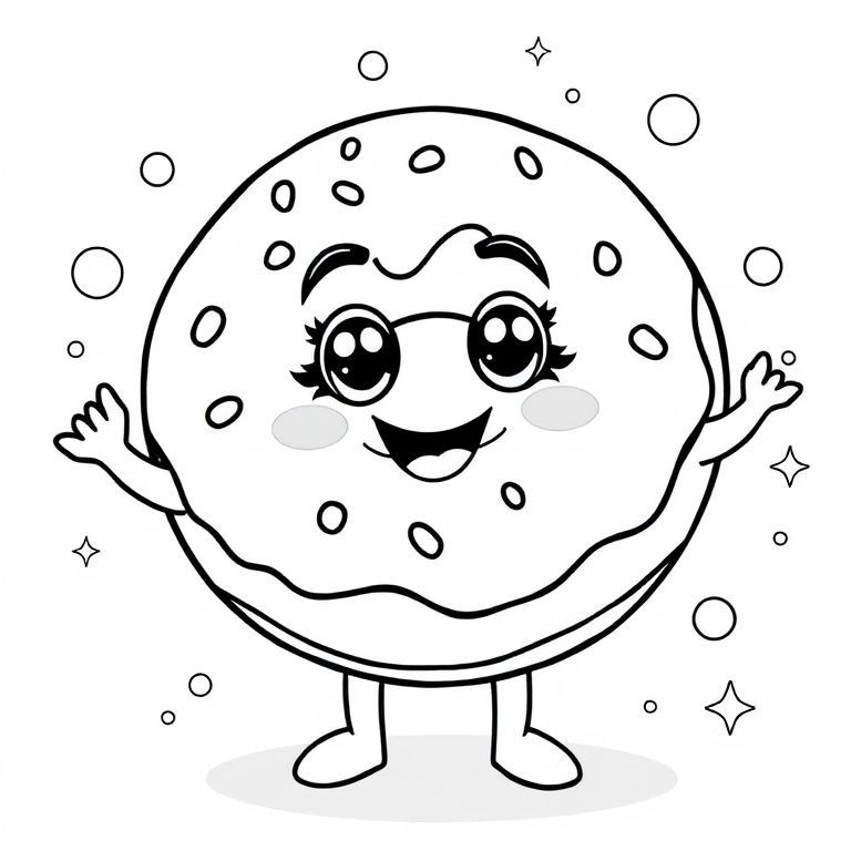 Một nhân vật bánh rán tròn với lớp kem nhỏ giọt mịn, những nếp tròn nhỏ cách đều nhau, khuôn mặt to đáng yêu với đôi mắt sáng bóng và nụ cười hạnh phúc. Chân hoạt hình ngắn, bàn tay nhỏ xíu vẫy tay. Các đường viền in đậm rất dày. Nền bao gồm các hình tròn mềm mại và lấp lánh nhỏ, đơn giản và cởi mở để tô màu.