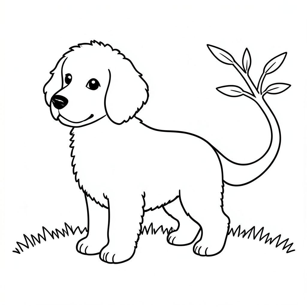 Một nhỏ, lông tơ đứng ở giữa. Đầu của nó hơi nghiêng về phía trước, hơi nhìn sang trái. Một cành đơn giản, màu trắng được đặt ở bên phải, uốn cong nhẹ nhàng. Cơ thể của chó thon dài và tròn trịa, với một đường cong nhẹ nhàng về phía lưng. Một cái đuôi màu trắng duy nhất kéo dài từ phía sau phần dưới cơ thể của nó. Nền là một trang tô màu mềm, cỏ., đen trắng, phong cách lowbook, nghệ thuật đường nét, đơn sắc, không màu, không đổ bóng, không xám, không tô màu, nền trắng, chỉ phác thảo, phong cách vector, thiết kế phẳng, 2d, chính xác một đuôi duy nhất, hoàn toàn không tô màu đen, nội thất trắng tinh khiết, không có miếng mực, không văn bản, không từ, không tiêu đề, hoàn toàn không màu, chỉ nghệ thuật đen trắng thuần túy