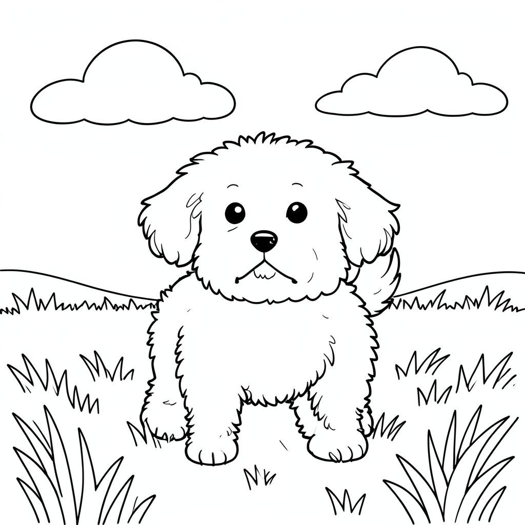 Một nhỏ, lông tơ đứng trên cánh đồng ánh sáng mặt trời. Một đám mây nhẹ nhàng, mỏng manh trôi qua hậu cảnh. Đầu của ở giữa, đuôi hơi cong lại. Hậu cảnh là một cánh đồng cỏ đơn giản, hơi mờ. Bố cục cân bằng, với chiếm một phần đáng kể của khung hình., trang màu, nghệ thuật đường nét, nền trắng
