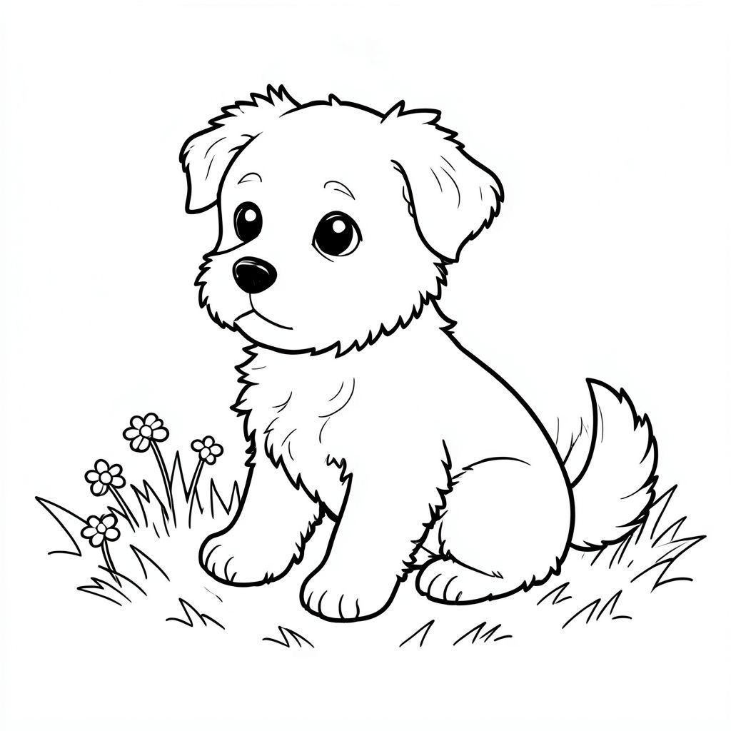 Một nhỏ, lông tơ ngồi nép mình trong một mảng ánh sáng mặt trời. hơi quay mặt sang trái, với đôi tai nhếch lên và biểu cảm nhẹ nhàng, tò mò trên khuôn mặt. Đuôi của nó hơi cong lại, cho thấy sự mãn nguyện. Nền là một mảng cỏ đơn giản, hơi mờ, với một vài bông hoa dại nhỏ nằm rải rác gần đó. Cỏ được hiển thị với một đường nét sạch sẽ, hơi có kết cấu., trang màu, nghệ thuật đường nét, nền trắng