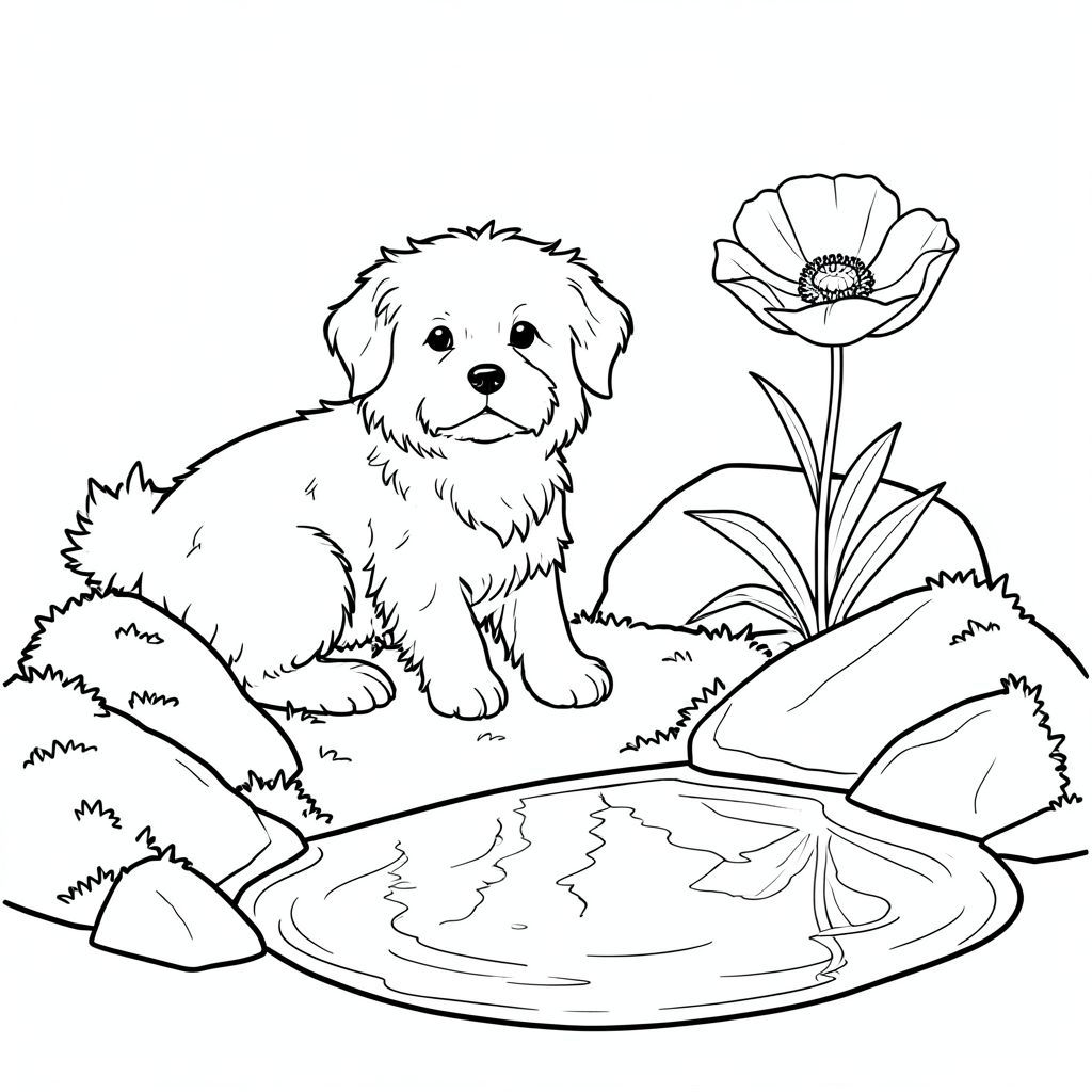 Một nhỏ, lông tơ với bộ lông ấm áp ngồi nép mình giữa một cụm đá phủ đầy rêu. Những tảng đá được sắp xếp theo một vòng cung uốn lượn, thoai thoải, dẫn đến một vũng nước nhỏ, nông phản chiếu ánh nắng lốm đốm. Một bông hoa anh túc duy nhất, hoàn hảo, nằm ngay bên cạnh, cánh hoa của nó hơi xù lông. Đuôi của hơi cong, hơi hướng về bên trái. Nền là một nền mềm mại, tắt tiếng, với các biến thể tinh tế trong tông màu để tạo chiều sâu., trang màu, nghệ thuật đường nét, nền trắng