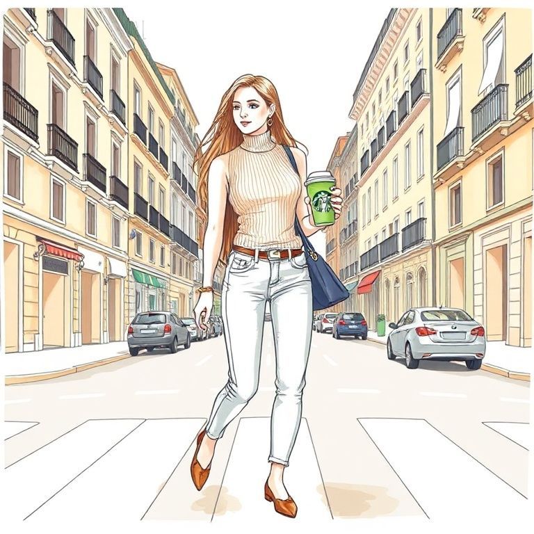 Một phụ nữ trẻ sành điệu được thể hiện rõ ràng đang băng qua đường ở Ý. Cô ấy đang ở giữa lối băng qua đường, một chân bước về phía trước, với những tòa nhà Ý xung quanh cô ấy với màu sắc ấm áp, dễ nhận biết (màu be, đất nung, vàng nịt). Khung cảnh tươi sáng và nắng, với màu sắc mạnh mẽ, rõ ràng.