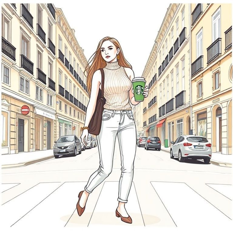 Phong cách nghệ thuật là màu nước ấm cúng thẩm mỹ, nhưng với màu sắc mạnh mẽ, dễ nhận biết - màu trung tính ấm áp, tông màu phấn, bóng mờ nhẹ nhàng và lineart sạch sẽ. Toàn bộ hình ảnh phải trông nữ tính, thời trang và rõ ràng lấy bối cảnh ở Ý khi cô ấy băng qua đường. Cô ấy 16 tuổi