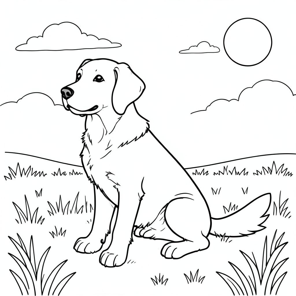 Một săn mồi ngồi bình tĩnh trên đồng cỏ đầy nắng. Đầu của được đặt hơi sang trái, với đuôi kéo dài tự nhiên sang phải. Ánh sáng mặt trời dịu nhẹ xuyên qua bầu trời, đổ bóng dịu dàng bên dưới cơ thể con vật. Một vài đám mây trắng lơ lửng phía trên. Bố cục cân bằng hình dạng của so với không gian mở, với mặt trời được đặt ở góc trên bên phải. Cảnh duy trì các đường nét đơn giản, sạch sẽ, không có hoặc bổ sung chi tiết. Đặc điểm của chú chó được xác định rõ ràng, không có bóng râm, thể hiện biểu cảm hòa bình, thân thiện. Nền vẫn tối giản chỉ với các yếu tố thiết yếu cần thiết để đóng khung đối tượng duy nhất., trang màu, nghệ thuật đường nét, nền trắng