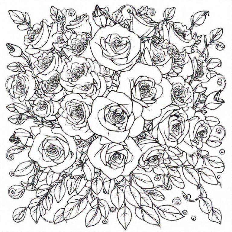 Một sự sắp xếp dày đặc của những bông hồng nở rộ, nụ nở một nửa và những chiếc lá cuộn tròn; mỗi cánh hoa chứa đầy các hoa văn vi mô như chấm, ren và bóng nở; dây leo xoáy tạo thành một nền lặp đi lặp lại liền mạch; Nghệ thuật đường nét tô màu thanh lịch dành cho người lớn với các đường viền siêu mịn.