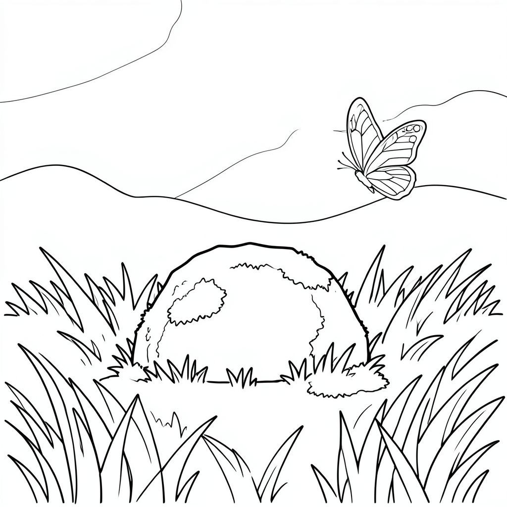 Một tảng đá nhỏ, phủ đầy rêu nằm ở trung tâm của một cánh đồng cỏ mềm. Một con bướm lười biếng bay gần đó, đôi cánh hơi mờ. Cỏ hơi nhấp nhô trong một làn gió nhẹ. Một bầu trời xa xôi, mờ mịt có thể nhìn thấy qua cỏ., trang màu, nghệ thuật đường nét, nền trắng