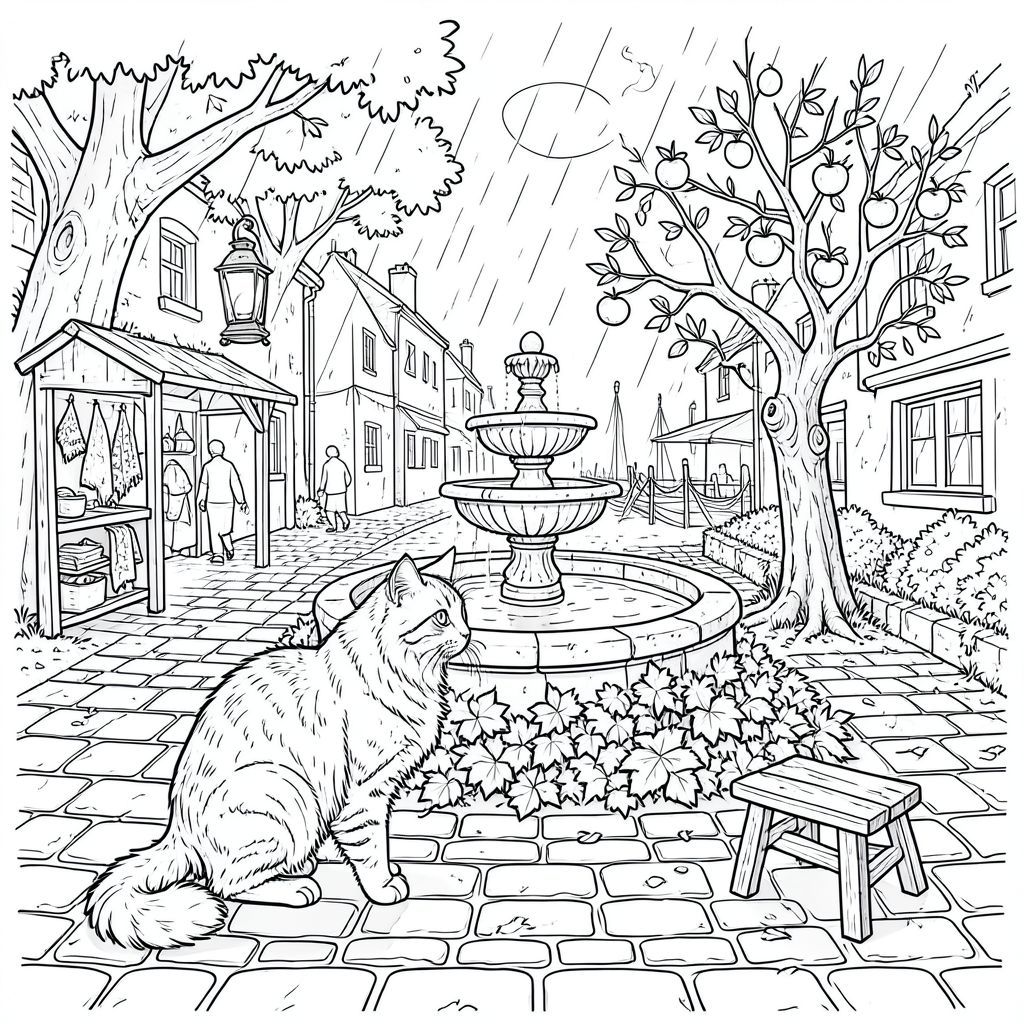 [HÌNH ẢNH: Một con mèo. Con mèo được đặt ở vị trí hơi bên trái của đài phun nước, quay lưng về phía người xem. Đôi mắt của nó là một sự giật mình, mãnh liệt . Đuôi dài và dày, hơi cong lại. Bộ lông dày đặc, hơi xù và sở hữu kết cấu tinh tế, mượt như nhung. Ánh mắt của con mèo không lay chuyển. Nền là một kết xuất hơi mờ, ấn tượng của Quảng trường Chợ Cũ, nhấn mạnh mưa và sự im lặng.], trang màu, nghệ thuật đường nét, nền trắng