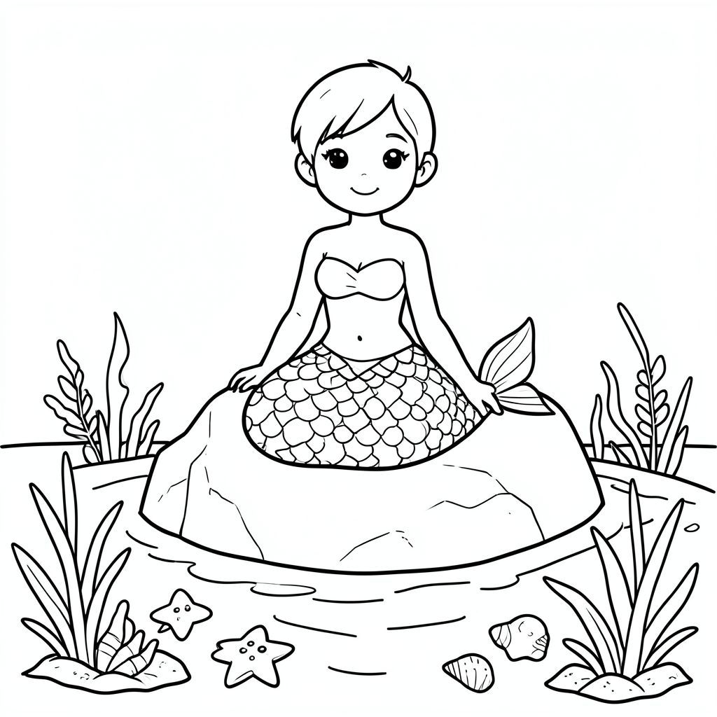 Nàng tiên cá ngồi trên một tảng đá có vỏ sò, xung quanh nước, sao cá, thực vật thủy sinh vẽ đường hoạt hình, trang tô màu trẻ em"