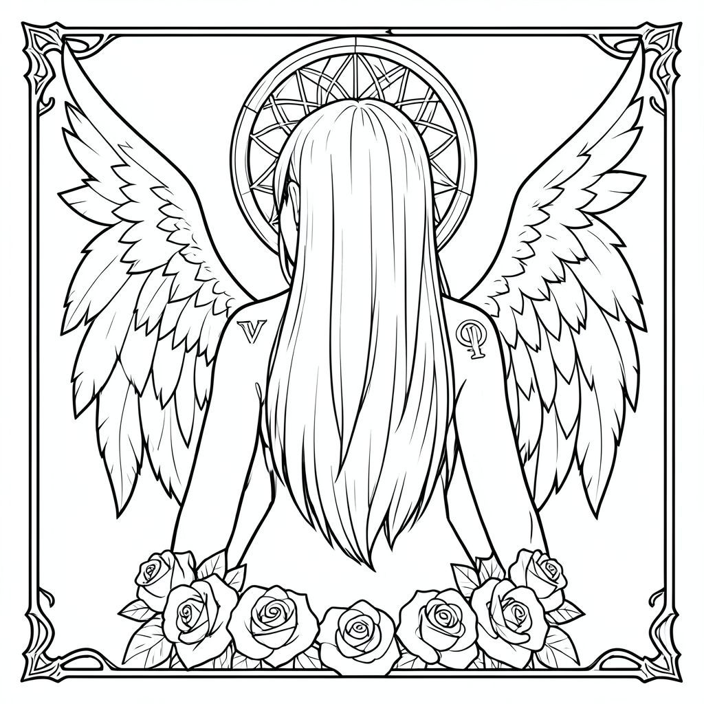 nghệ thuật đường nét đen trắng, người phụ nữ quay đầu, tóc thẳng dài che một mắt, đôi cánh lông vũ lớn phía sau, hoa hồng ở phía dưới, vòng tròn dreamcatcher sau đầu, biểu tượng Xử Nữ trên vai, đường viền khung gothic, đường nét chi tiết nhưng đơn giản, không màu