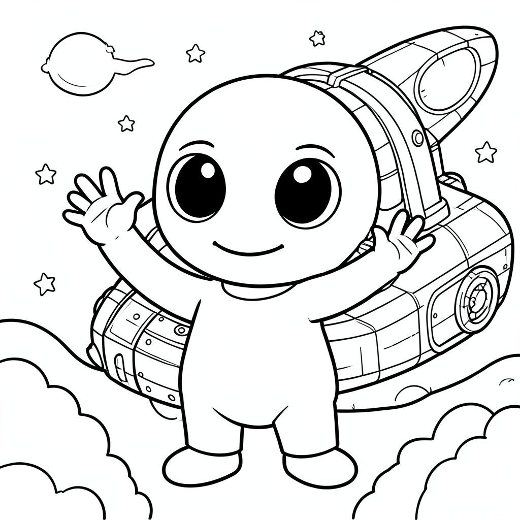 Người ngoài hành tinh dễ thương vẫy tay xin chào, với backgroung của nghệ thuật hoạt hình tàu vũ trụ, trang tô màu trẻ em "
