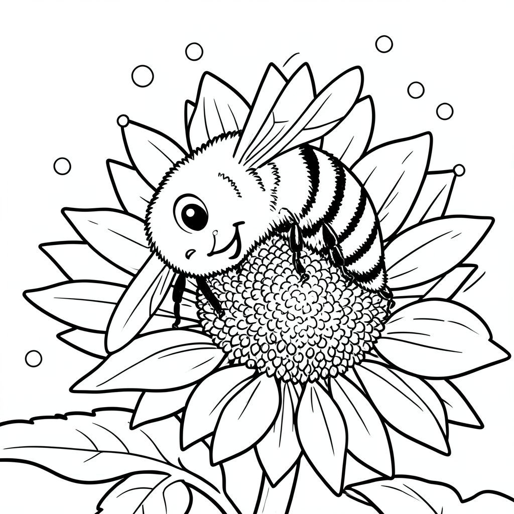 Nhắc nhở: Một con ong vò vẽ lông tơ với đôi mắt to thân thiện đáp xuống một bông hoa hướng dương khổng lồ, nghệ thuật đường nét đen trắng, phong cách sách tô màu dành cho trẻ em, đường viền dày sạch sẽ, độ tương phản cao, nền trắng, chi tiết đơn giản, không đổ bóng, chế độ xem cận cảnh macro, cánh ong là hình dạng phác thảo đơn giản, cánh hoa hướng dương có chi tiết đường nét đơn giản, chấm phấn hoa lơ lửng trong không khí dưới dạng vòng tròn nhỏ, Con ong có những đoạn cơ thể sọc, biểu cảm mỉm cười.