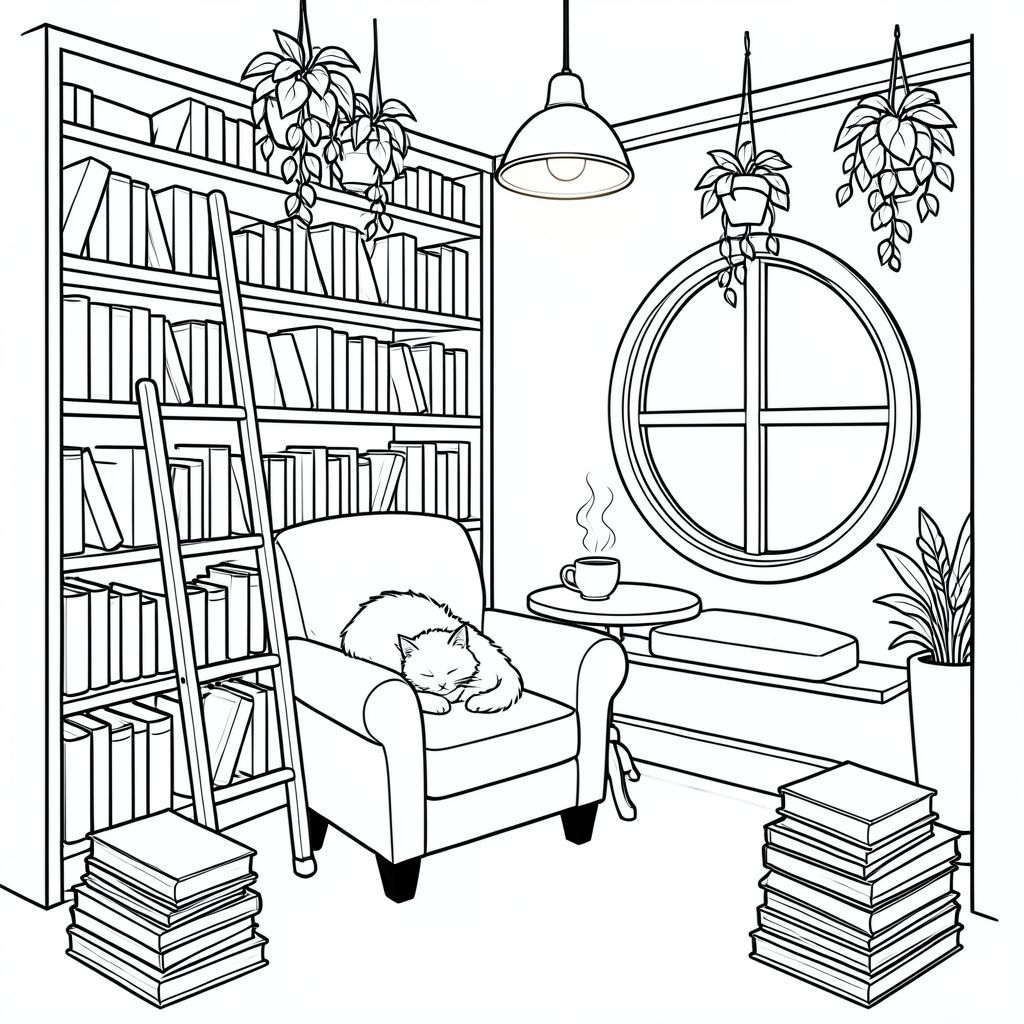 Nhắc nhở: Một góc ấm cúng của một hiệu sách nhỏ với các kệ sách từ sàn đến trần chật kín sách, một chiếc thang lăn dựa vào kệ, một con mèo lông xù cuộn tròn trên ghế bành, một chiếc cốc bốc hơi trên bàn phụ, một cửa sổ tròn với một chiếc ghế đệm, cây treo trên trần nhà, chồng sách trên sàn, đèn ấm áp treo phía trên, Nghệ thuật đường nét đen trắng, phong cách sách tô màu dành cho trẻ em, đường viền dày sạch sẽ, độ tương phản cao, chi tiết đơn giản, nền chi tiết ấm cúng.