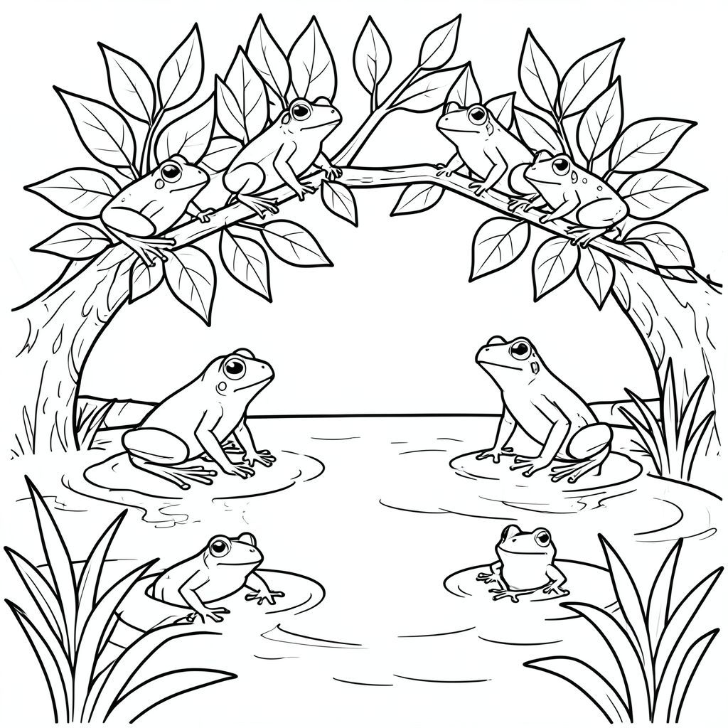 Nhiều con ếch ngồi trên lá cây trôi nổi trong ao