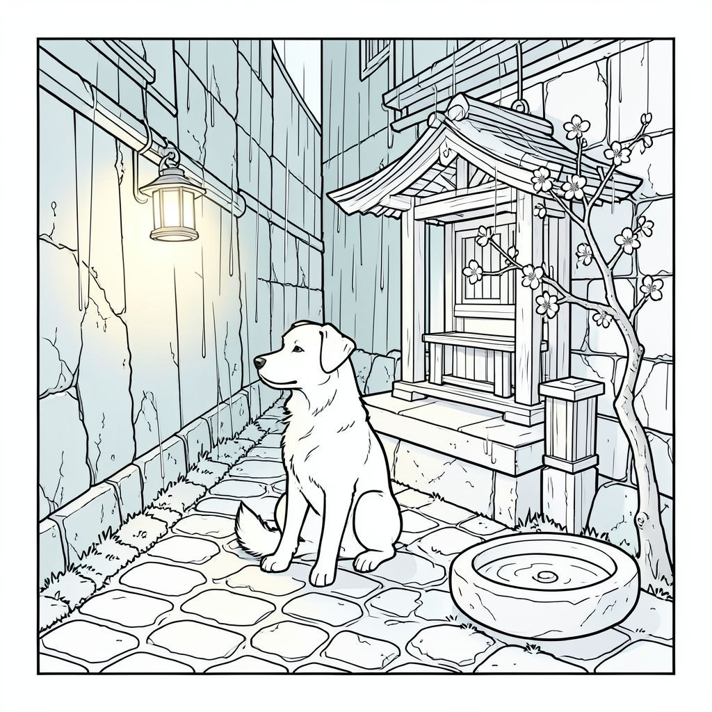 Những cơn mưa đổ xuống một con hẻm hẹp, phủ đầy rêu ở một quận Tokyo cổ kính, yên tĩnh. Một chiếc đèn lồng bằng gỗ duy nhất, bị phong hóa tỏa ra ánh sáng ấm áp trên những viên đá cuội, chiếu sáng một ngôi đền nhỏ, được sắp xếp tỉ mỉ nằm trong một góc bóng tối. Một cành hoa anh đào duy nhất, được tạo hình hoàn hảo, vẫn bám vào tảng đá ẩm, nằm tinh tế bên cạnh một chậu đá nhỏ, nhẵn chứa đầy nước mưa. , một bóng bẩy, ngồi kiên nhẫn ở trung tâm của ngôi đền, đầu hơi nghiêng như thể đang quan sát cơn mưa. Đuôi của nó uốn cong nhẹ nhàng, một đường cong tinh tế gợi lên một khoảnh khắc trầm ngâm. Nền là một bảng màu xanh lam và xanh lá cây trầm lặng, gợi ý viên đá ướt đẫm mưa và không gian bóng tối., trang màu, nghệ thuật đường nét, nền trắng