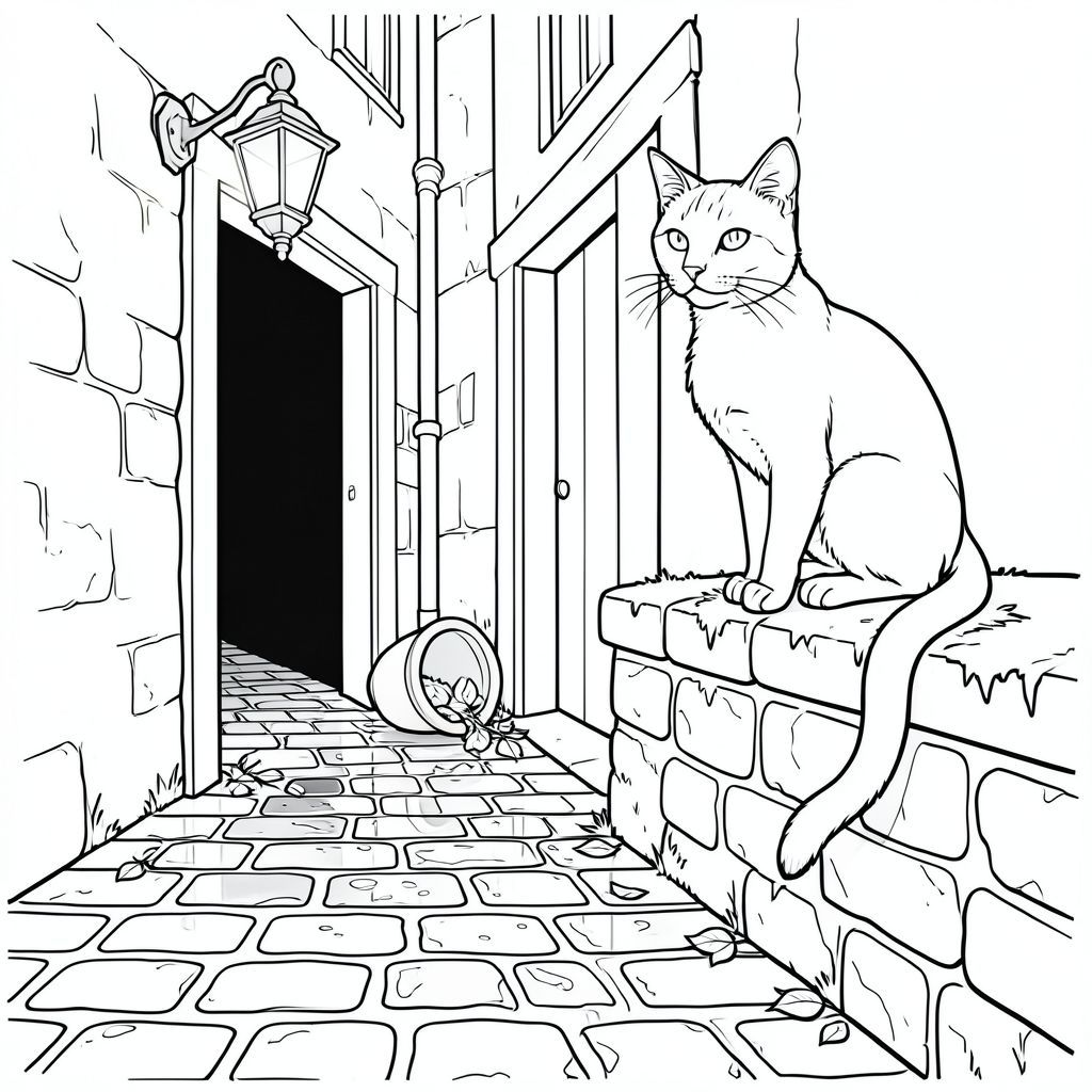 Một con mèo, bóng bẩy và trầm tư, ngồi đậu trên một bức tường đá phủ đầy rêu, đuôi cuộn tròn thanh lịch quanh bàn chân. Khuôn mặt của nó là một mặt nạ của sự quan sát lặng lẽ, một đường cong tinh tế của mũi gợi lên một cái nhìn nhẹ nhàng, hiểu biết. Bộ lông của mèo phong phú, ấm áp, bắt mờ ., tô màu, nghệ thuật đường nét, nền trắng