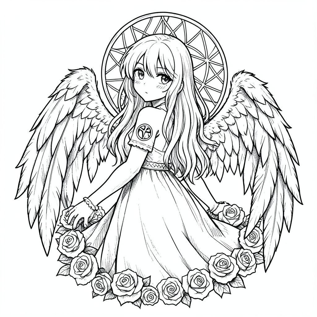 phác thảo gothic tối, vẽ mực đen trắng, cô gái thiên thần manga thực tế, tóc dài lộn xộn, nhìn lại, đôi cánh lông vũ chi tiết, hoa hồng xung quanh cơ thể, dreamcatcher phía sau, biểu tượng Xử Nữ trên vai, khung cổ điển, đổ bóng nặng, kết cấu bút chì, nghệ thuật đường nét mỏng và thô, không dễ thương, không hoạt hình, không màu sắc