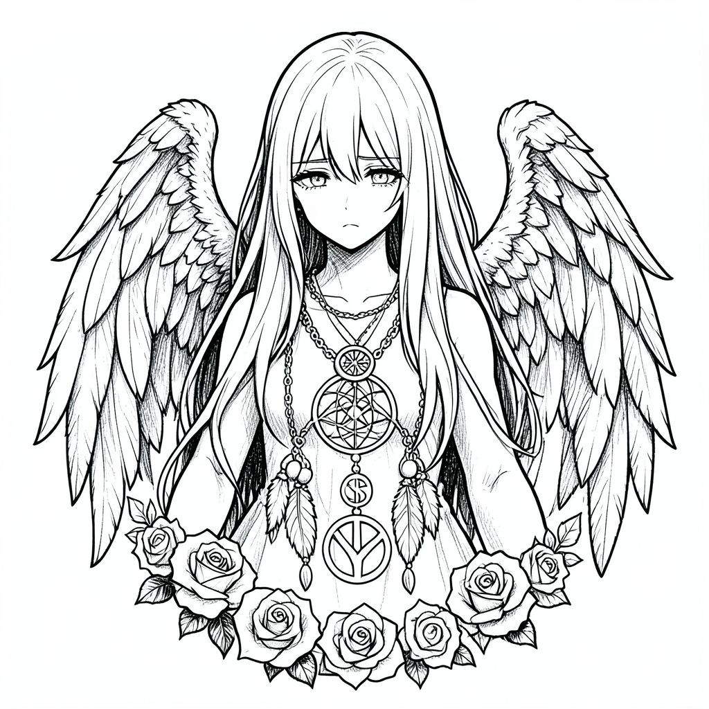 phác thảo hình xăm gothic đen trắng, phong cách anime thực tế (không dễ thương), cô gái thiên thần buồn, tóc dài che mặt, đôi cánh chi tiết, hoa hồng, dreamcatcher, biểu tượng xử nữ, bóng tối, kết cấu phác thảo bút chì, đường thô, minh họa cổ điển, không màu