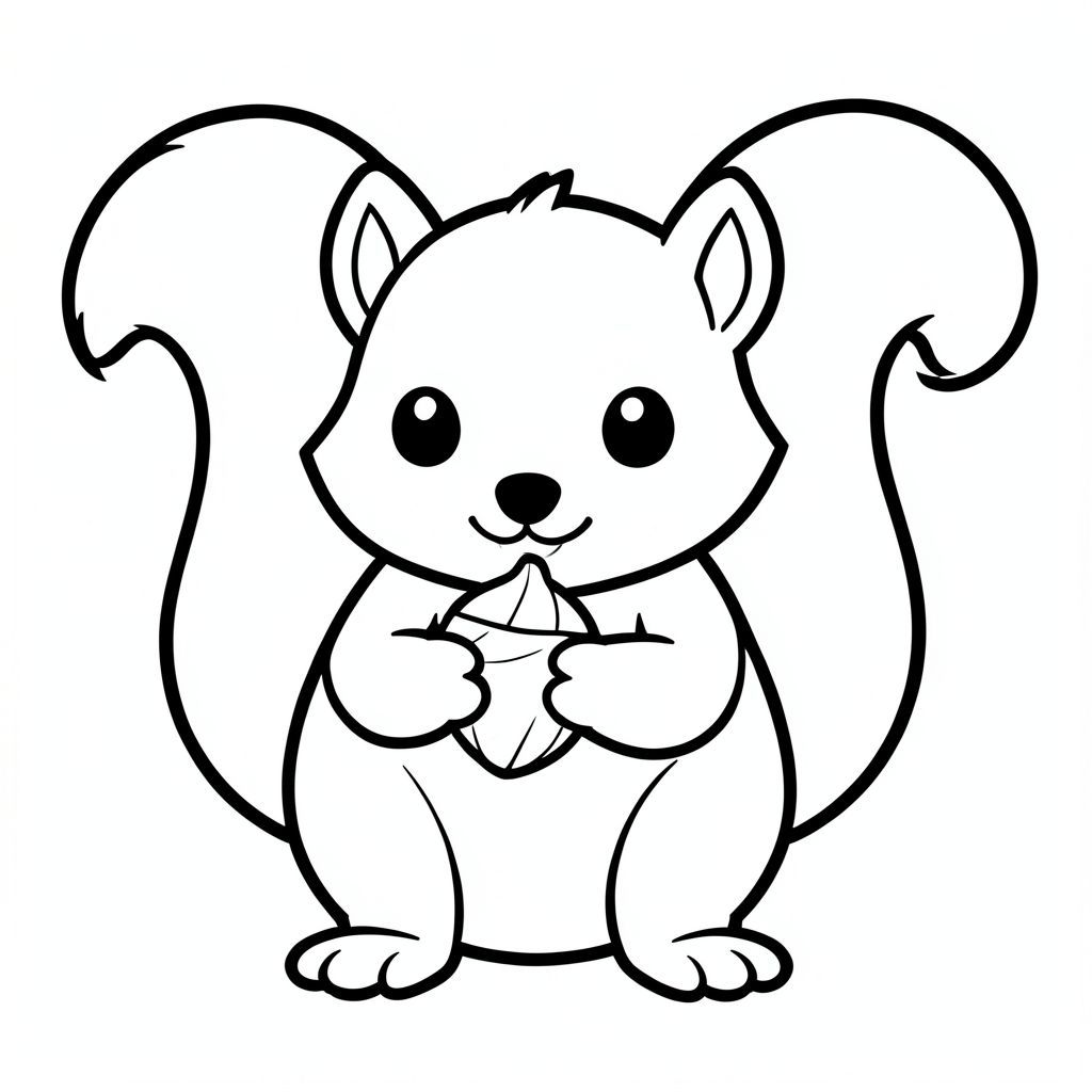 Sóc con dễ thương cầm một quả hạch, nghệ thuật đường nét đen trắng, đường viền dày rất đậm, không đổ bóng, không thang độ xám, chi tiết tối thiểu, ký tự lớn ở giữa, hình dạng đơn giản, nền trắng, trang sách tô màu cho trẻ mới biết đi 3-5 tuổi, 8.5x11, độ phân giải cao