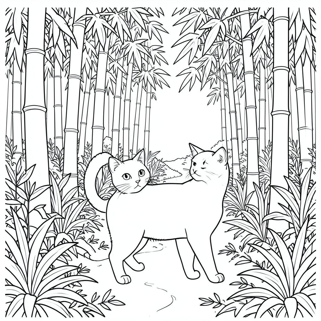 solo, chủ đề đơn, bốn chân, một cái đầu, một cái đuôi, đúng giải phẫu, con mèo, rừng tre rậm rạp, thân cây cao, ánh sáng mặt trời lốm đốm, tán lá chi tiết, con đường quanh co, nền intrie, thảm thực vật tươi tốt, bầu không khí thanh bình, tự nhiên, sàn rừng, trang màu, nghệ thuật đường, nền trắng, solo, chủ đề đơn, chính xác về mặt giải phẫu, giải phẫu hoàn hảo