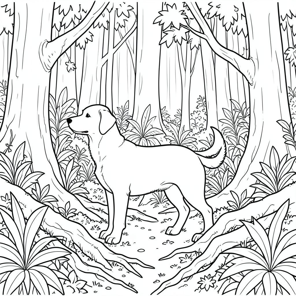 solo, chủ đề đơn, bốn chân, một cái đầu, một cái đuôi, đúng về mặt giải phẫu,, rừng nhiệt đới rậm rạp, mặt đất rêu phong, cây cổ thụ, thảm thực vật cao chót vót, tán lá tươi tốt, bầu không khí ẩm ướt, lốm đốm, sàn rừng, rễ phức tạp, cành cây gồ ghề, trang tô màu, nghệ thuật đường, nền trắng, solo, chủ đề đơn, chính xác về mặt giải phẫu, giải phẫu hoàn hảo