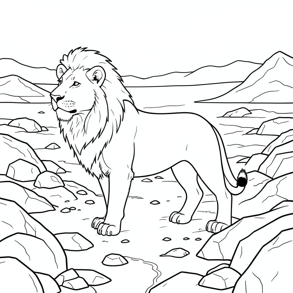 solo, chủ đề đơn, bốn chân, một đầu, một đuôi, chính xác về mặt giải phẫu, sư tử, băng tuyết, rộng lớn, tảng đá, rải rác, địa hình đá, hoang vắng, mở rộng, phong cảnh, toàn cảnh, góc rộng, trang màu, nghệ thuật đường nét, nền trắng, solo, chủ đề đơn, chính xác về mặt giải phẫu, giải phẫu hoàn hảo