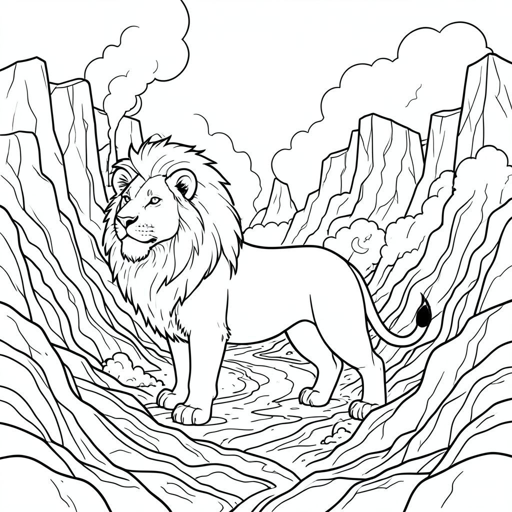 solo, chủ đề đơn, bốn chân, một đầu, một đuôi, chính xác về mặt giải phẫu, sư tử, hẻm núi lửa, dòng dung nham cứng, lỗ thông hơi, hoạt động địa nhiệt, thành tạo đá, vách đá lởm chởm, vết nứt, cặn lưu huỳnh, sương mù xoáy, sương mù, trang màu, nghệ thuật đường nét, nền trắng, solo, chủ đề đơn, chính xác về mặt giải phẫu, giải phẫu hoàn hảo