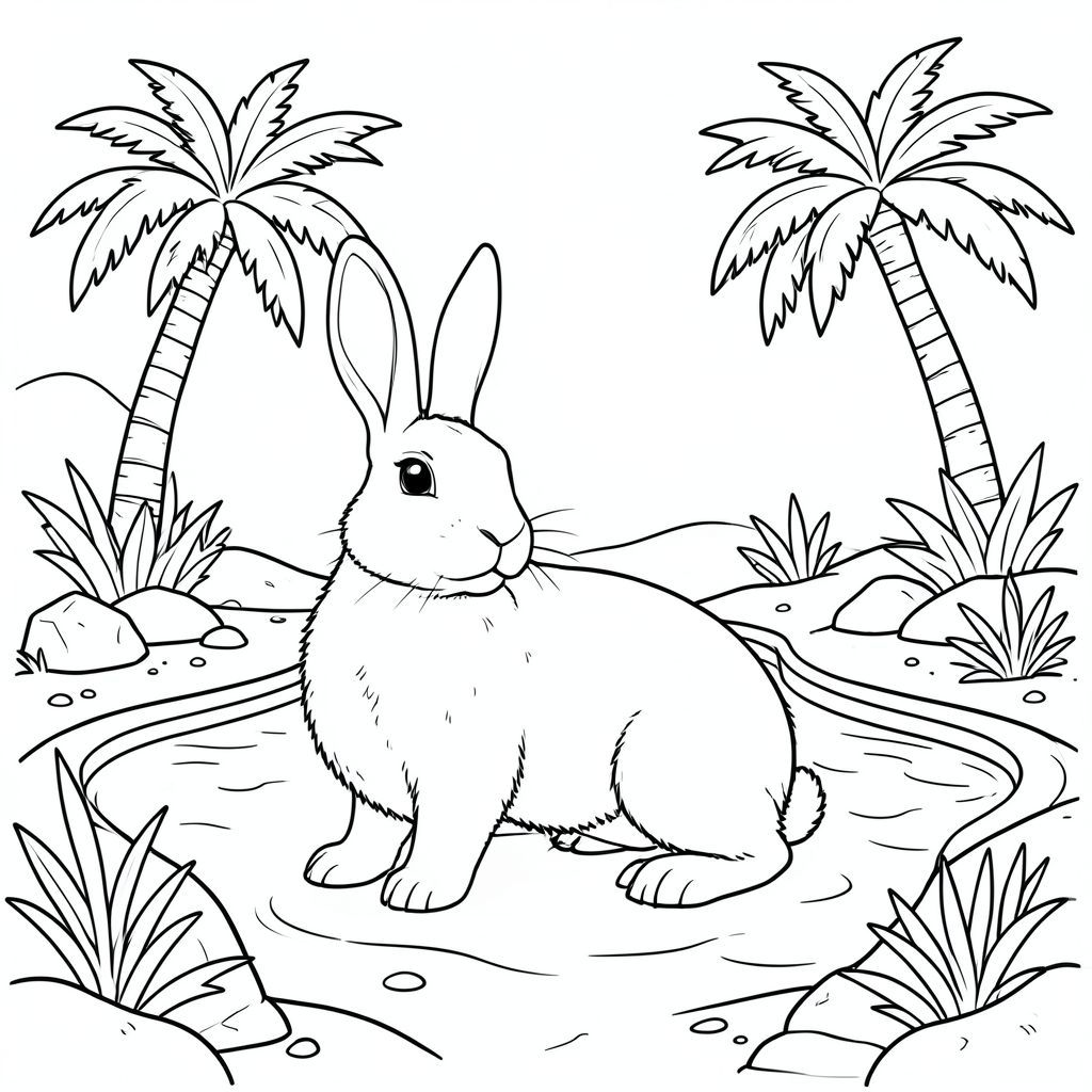 solo, chủ đề đơn, bốn chân, một đầu, một đuôi, chính xác về mặt giải phẫu, thỏ, sa mạc, ốc đảo, hồ bơi, cây cọ, ánh sáng mặt trời, nước trong, cát, đá, thảm thực vật, gió nhẹ, trang màu, nghệ thuật đường nét, nền trắng, solo, chủ đề đơn, đúng giải phẫu, giải phẫu hoàn hảo