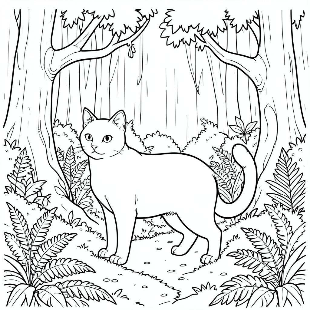 solo, chủ đề đơn, bốn chân, một đầu, một đuôi, đúng giải phẫu, con mèo, rêu dày đặc, cây cổ thụ, rừng nhiệt đới, tán cây, dương xỉ, bụi rậm, lốm đốm, chi tiết intrie, thực tế, thảm thực vật tươi tốt, trang màu, nghệ thuật đường, nền trắng, solo, chủ đề đơn, đúng về mặt giải phẫu, giải phẫu hoàn hảo