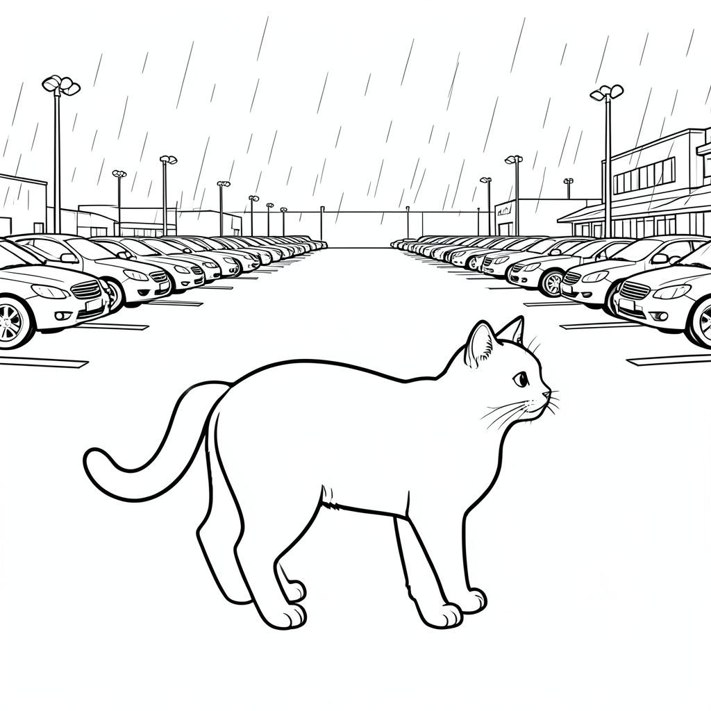 solo, chủ đề đơn, bốn chân, một đầu, một đuôi, đúng về mặt giải phẫu, con mèo, lái xe, bãi đậu xe, hàng ô tô, nhựa đường, mưa, đèn, đèn mờ, mở rộng, góc rộng, chạng vạng, trang màu, nghệ thuật đường nét, nền trắng, solo, chủ đề đơn, đúng giải phẫu, giải phẫu hoàn hảo