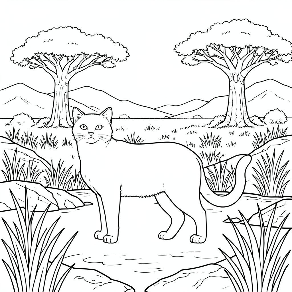 solo, chủ đề đơn, bốn chân, một đầu, một đuôi, đúng về mặt giải phẫu, con mèo, Savanna, đồng cỏ mở, cỏ cao, cây bao báp, ánh sáng mặt trời, những ngọn núi xa xôi, bầu trời, nước trong, địa hình đá, đá phong hóa, trang màu, nghệ thuật đường, nền trắng, solo, chủ đề đơn, đúng về mặt giải phẫu, giải phẫu hoàn hảo