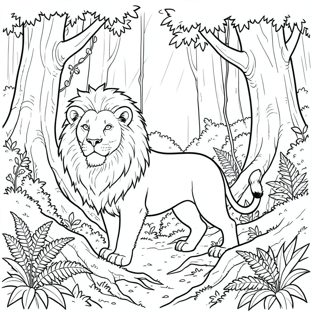 solo, chủ đề đơn, bốn chân, một đầu, một đuôi, đúng về mặt giải phẫu, sư tử, rêu dày đặc, cây khổng lồ, rễ cổ xưa, lọc ánh sáng mặt trời, không khí ẩm, dương xỉ, dây leo, tán lá, nhiều lớp, kết cấu, trang màu, nghệ thuật đường, nền trắng, solo, chủ đề đơn, đúng về mặt giải phẫu, giải phẫu hoàn hảo