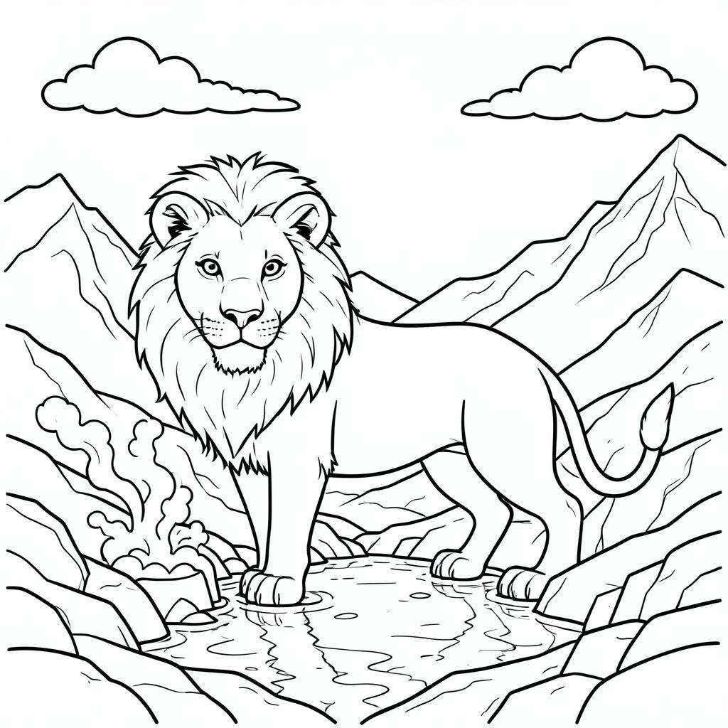 solo, chủ đề đơn, một đầu, hai mắt, hai tai, bốn chân, một đuôi, đúng giải phẫu, sư tử, núi tuyết, thung lũng, suối nước nóng, hơi nước, ánh sáng mặt trời, phản chiếu, bầu trời, đám mây, đỉnh xa, địa hình đá, trang màu, nghệ thuật đường, nền trắng, solo, chủ đề đơn, đúng giải phẫu, giải phẫu hoàn hảo