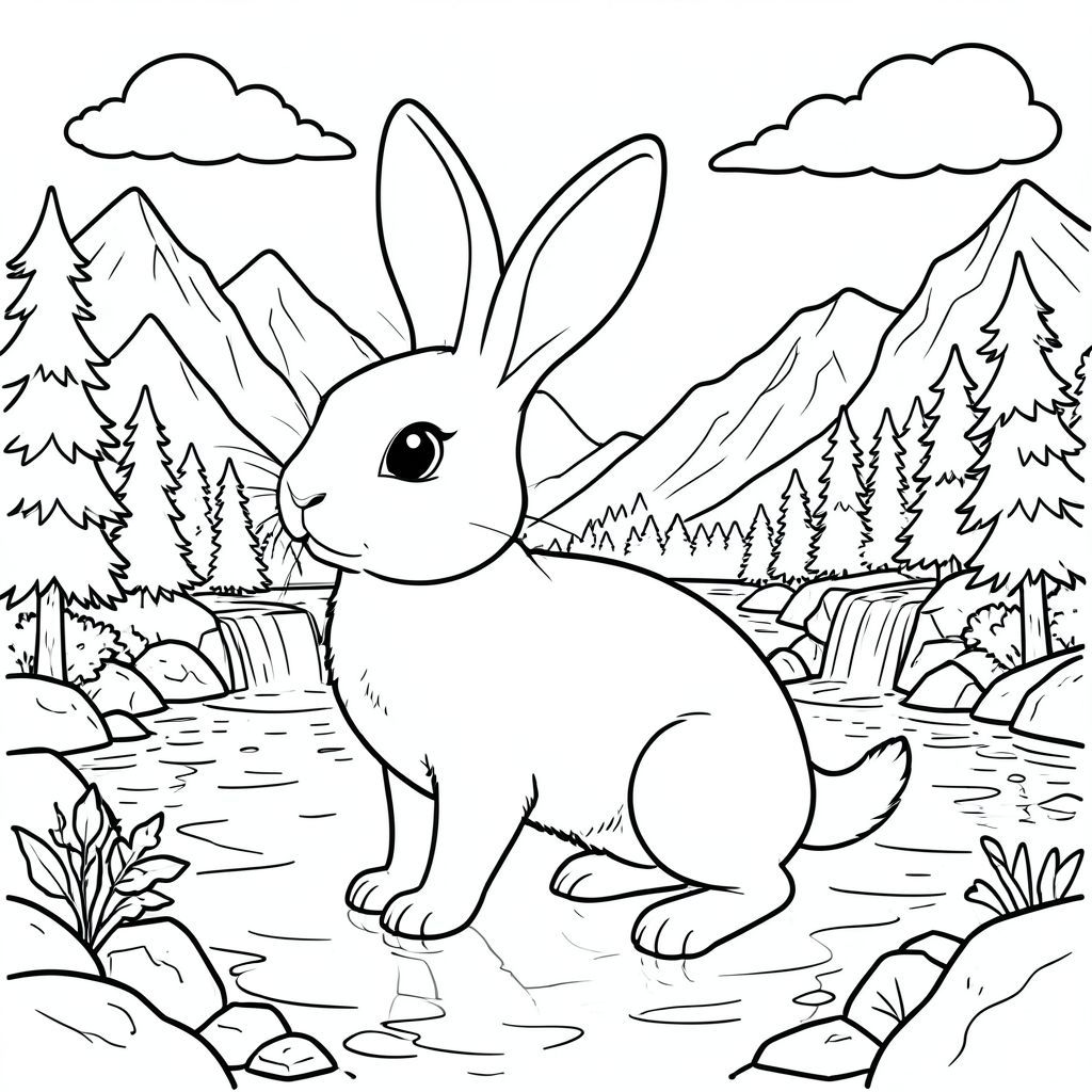 solo, chủ đề đơn, một đầu, hai mắt, hai tai, bốn chân, một đuôi, đúng về mặt giải phẫu, thỏ, hồ, thác nước, núi, rừng, đá, Bầu trời, đám mây, Ánh sáng mặt trời, Sự phản chiếu, trang tô màu, nghệ thuật đường nét, nền trắng, Solo, chủ đề đơn, đúng giải phẫu, giải phẫu hoàn hảo