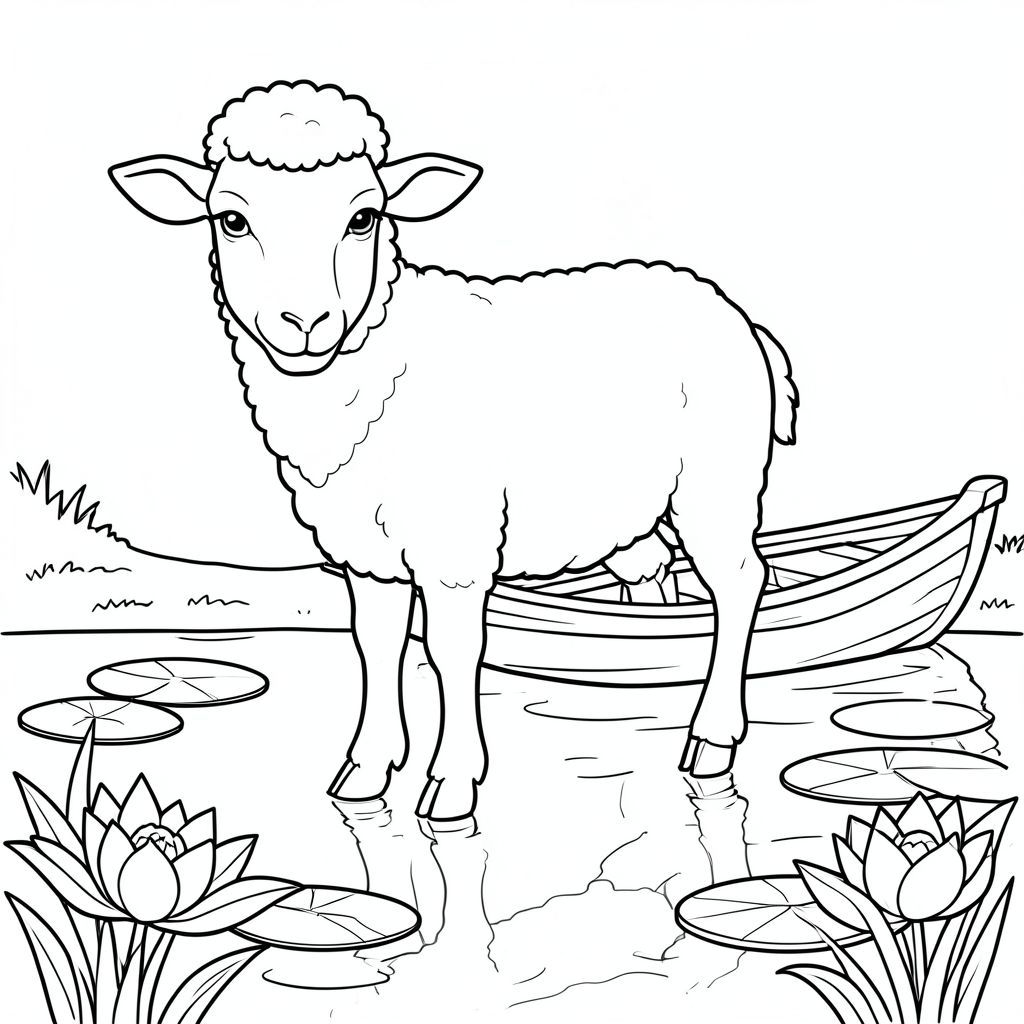 solo, chủ đề đơn, một đầu, hai mắt, hai tai, bốn chân, một đuôi, tỷ lệ tự nhiên, quy mô thích hợp trong môi trường, chính xác về mặt giải phẫu, Cừu, ao, miếng đệm hoa loa kèn, thuyền chèo, nước, điềm tĩnh, tĩnh lặng, mịn, phản chiếu, ánh sáng mặt trời, trong sáng, trang màu, nghệ thuật đường, nền trắng, solo, chủ đề đơn, đúng về mặt giải phẫu, giải phẫu hoàn hảo