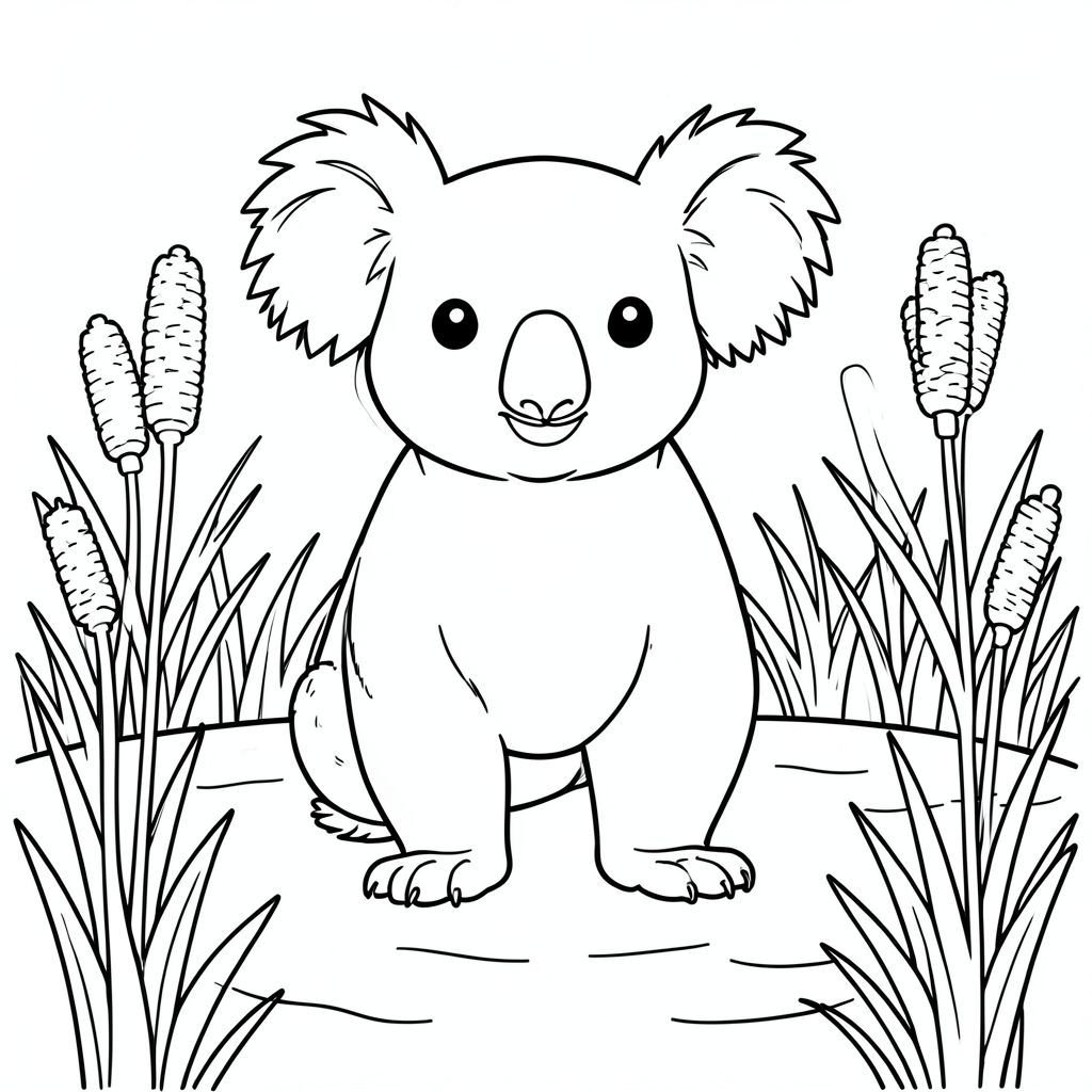 solo, chủ đề đơn, một đầu, hai mắt, hai tai, bốn chân, một đuôi, tỷ lệ tự nhiên, quy mô thích hợp trong môi trường, chính xác về mặt giải phẫu, Koala, Cattails, bulrushes, ao đất ngập nước, nhỏ, đơn giản, sạch sẽ, lý lịch, cánh đồng, cây xanh, Nước, trang tô màu, nghệ thuật đường, nền trắng, Solo, chủ đề đơn, chính xác về mặt giải phẫu, giải phẫu hoàn hảo