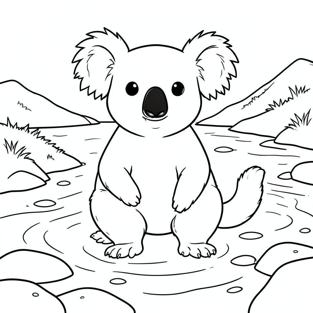 solo, chủ đề đơn, một đầu, hai mắt, hai tai, bốn chân, một đuôi, tỷ lệ tự nhiên, quy mô thích hợp trong môi trường, chính xác về mặt giải phẫu, Koala, Kênh thủy triều, cồn cát, nước nông, nước ấm, ánh sáng mặt trời, rõ ràng, mịn, đá, cát, đường bờ biển, trang màu, nghệ thuật đường, nền trắng, solo, chủ đề đơn, chính xác về mặt giải phẫu, giải phẫu hoàn hảo