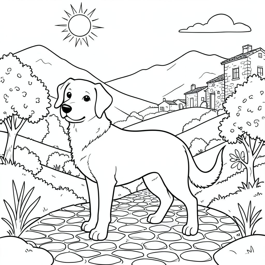 solo, chủ đề đơn, một đầu, hai mắt, hai tai, bốn chân, một đuôi, tỷ lệ tự nhiên, quy mô thích hợp trong môi trường, đúng giải phẫu,, cây cối, đồi thoai thoải, bầu trời nắng, phong cảnh Địa Trung Hải, rộng mở, rõ ràng, những ngọn núi xa xôi, các tòa nhà mộc mạc, đá phong hóa, đường lát đá cuội, trang màu, nghệ thuật đường, nền trắng, solo, chủ đề đơn, đúng về mặt giải phẫu, giải phẫu hoàn hảo