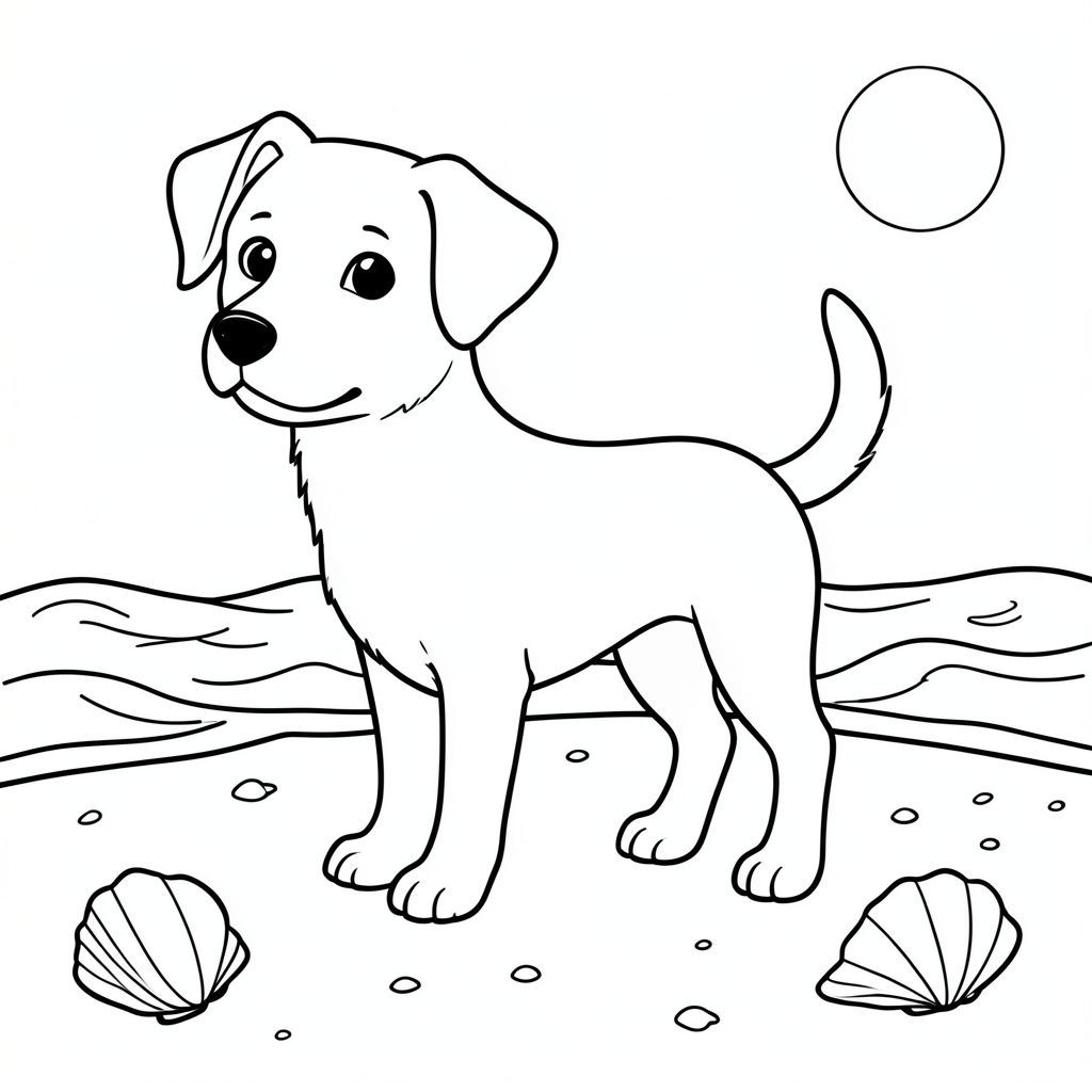 solo, chủ đề đơn, một đầu, hai mắt, hai tai, bốn chân, một đuôi, tỷ lệ tự nhiên, quy mô thích hợp trong môi trường, đúng giải phẫu, chó, Bãi cát, sóng, vỏ sò, cát, nước trong, ánh sáng mặt trời, điềm tĩnh, nhẹ nhàng, nhỏ, đơn giản, tô màu, nghệ thuật đường, nền trắng, solo, chủ đề đơn, đúng về mặt giải phẫu, giải phẫu hoàn hảo