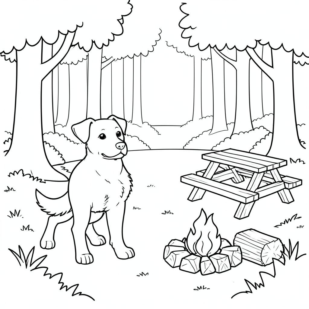 solo, chủ đề đơn, một đầu, hai mắt, hai tai, bốn chân, một đuôi, tỷ lệ tự nhiên, quy mô thích hợp trong môi trường, đúng giải phẫu, chó, cây cối, rừng, ánh sáng mặt trời, dọn dẹp, bàn dã ngoại, vòng lửa, Gỗ, đơn giản, dọn dẹp, lý lịch, tô màu, nghệ thuật đường, nền trắng, solo, chủ đề đơn, đúng về mặt giải phẫu, giải phẫu hoàn hảo